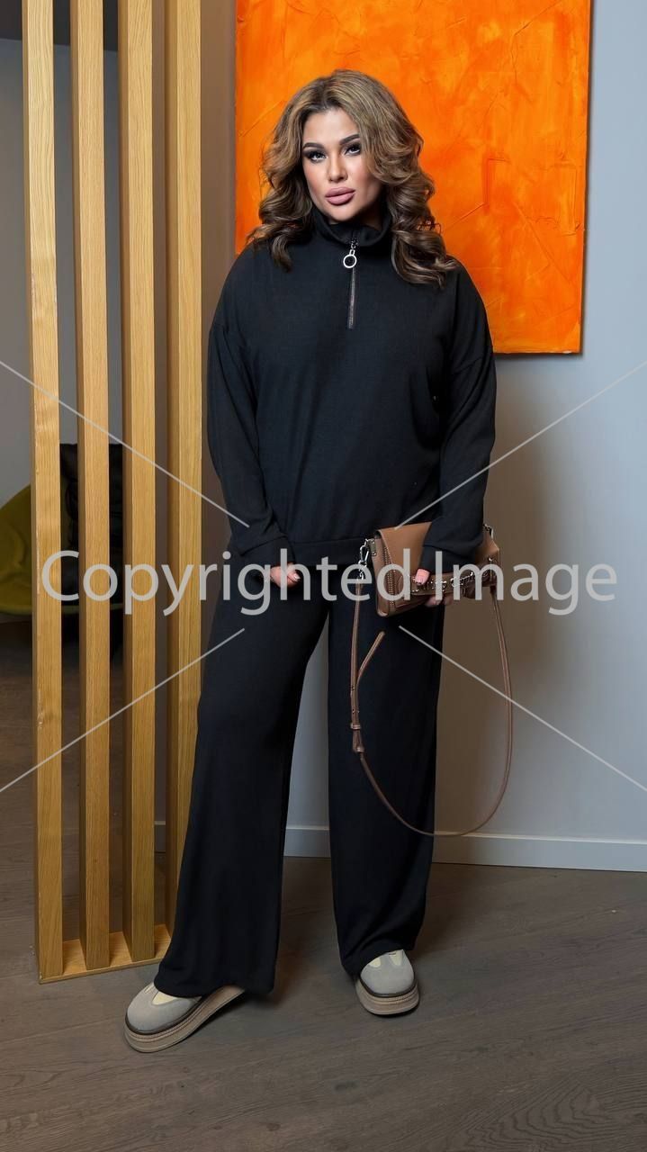 Довжина штанів : 110 см. Стильний костюм двійка . Штани з високою посадкою , пояс на гумці . Кофта прямого покрою на манжеті , комір на блискавці .