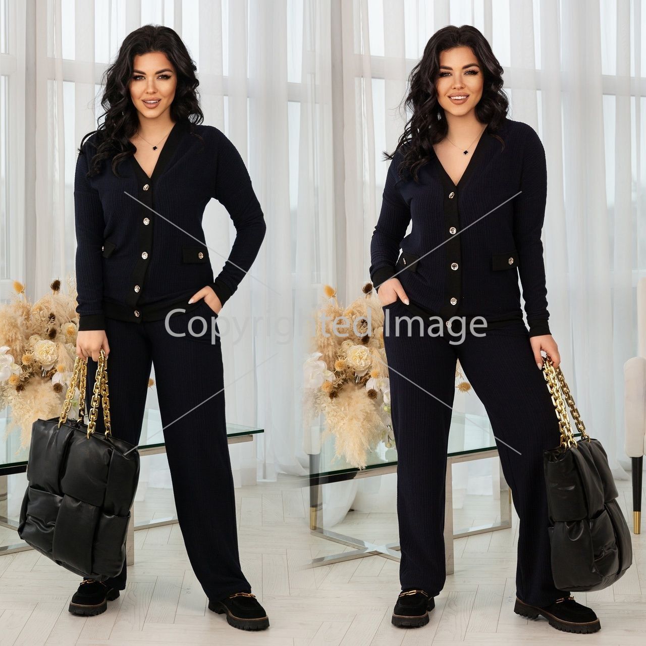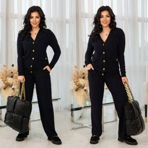 Стильний та теплий костюм в стилі Шанель , кофта + штани . Тканина добре тягнеться , приємна до тіла , не кашлатеться .Штани прямого покрою з кишенями , пояс на резинці . Кофта на гудзиках , рукав на манжеті .