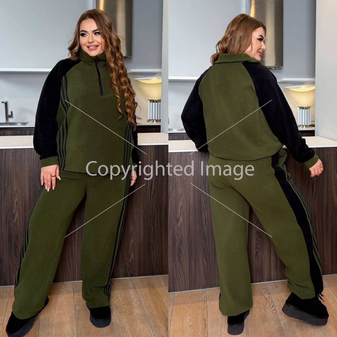 Довжина штанів : 110 см. Штани з ломпасом , з високою посадкою , пояс на гумці , бічні кишені , низ на фіксаторі . Кофта з ломпасом прямого покрою , з коміром на блискавці , рукав реглан .