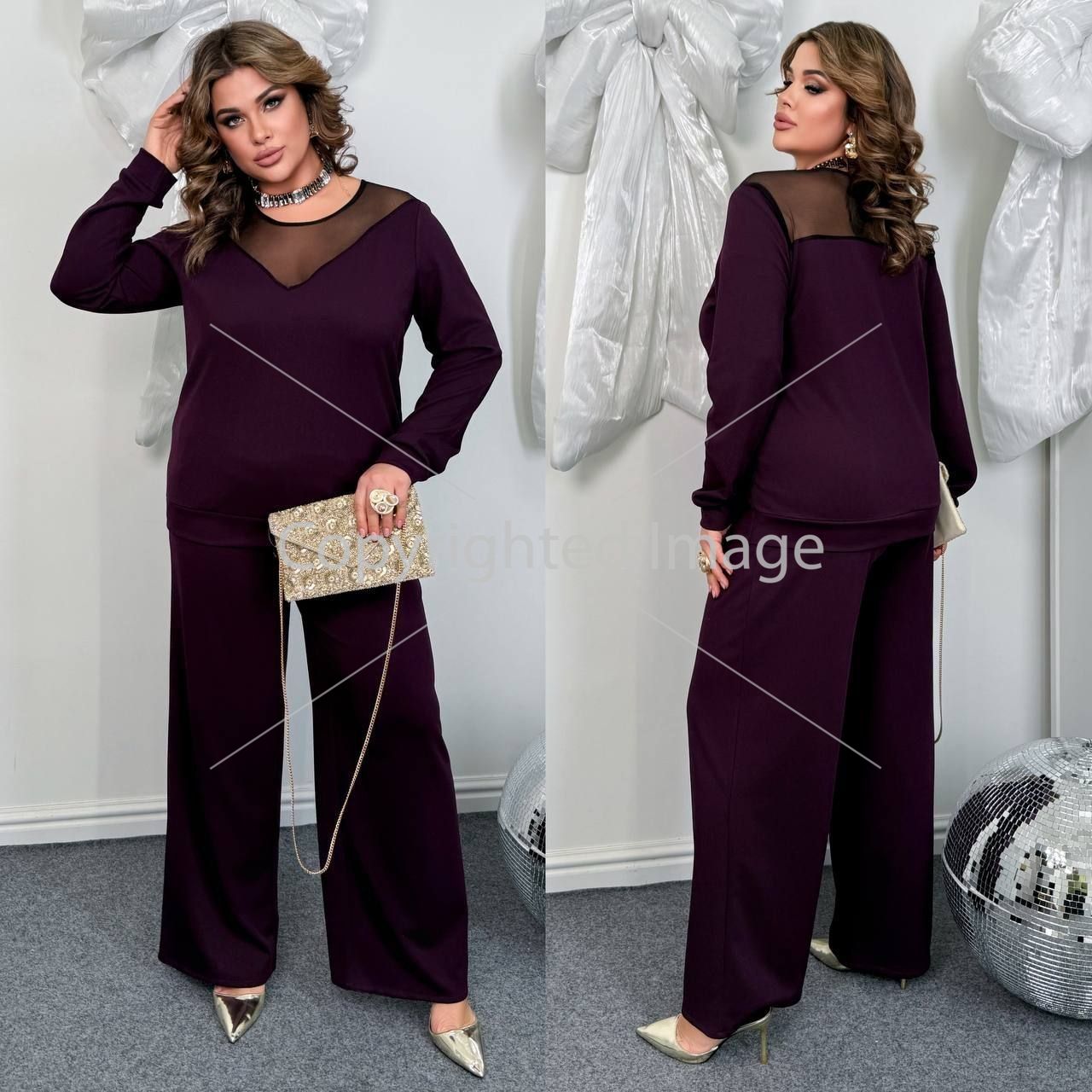 Довжина штанів : 110 см. Святковий костюм двійка . Штани з високою посадкою , пояс на гумці . Кофта прямого покрою на манжеті , з V - подібною вставкою з сітки .