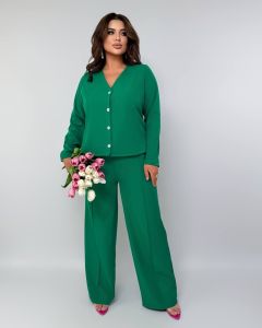 Штани з високою посадкою , пояс на гумці , бічні кишені , з переду стрілки . Піджак на ґудзиках з заду завʼязка .
