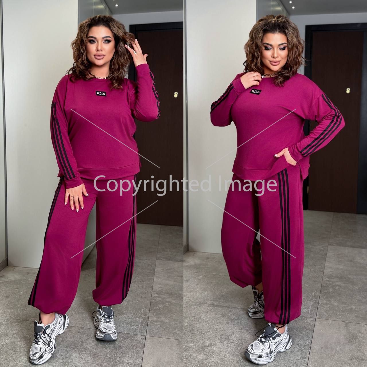 Кофта прямого покрою на манжеті , рукав з ломпасом . Штани з бічними ломпасами , з високою посадкою , пояс на гумці , з бічними кишенями , низ на фіксаторі .