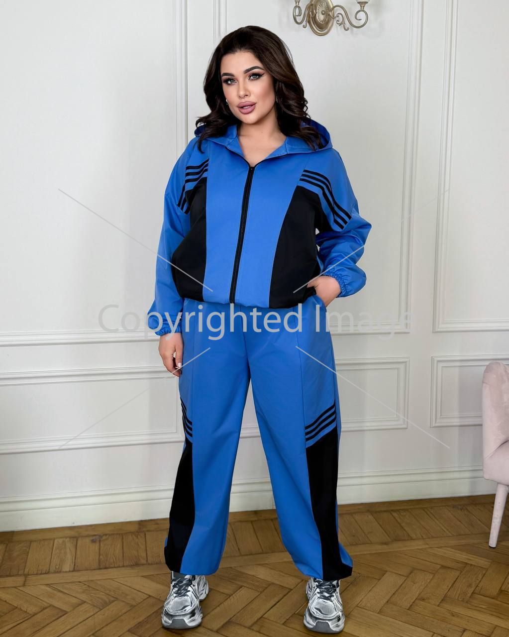 Довжина штанів : 106 см. Широкі штани з високою посадкою , пояс на гумці , бічні кишені . Кофта прямого покрою з планкою , бічні розрізи , з заду подовжена .