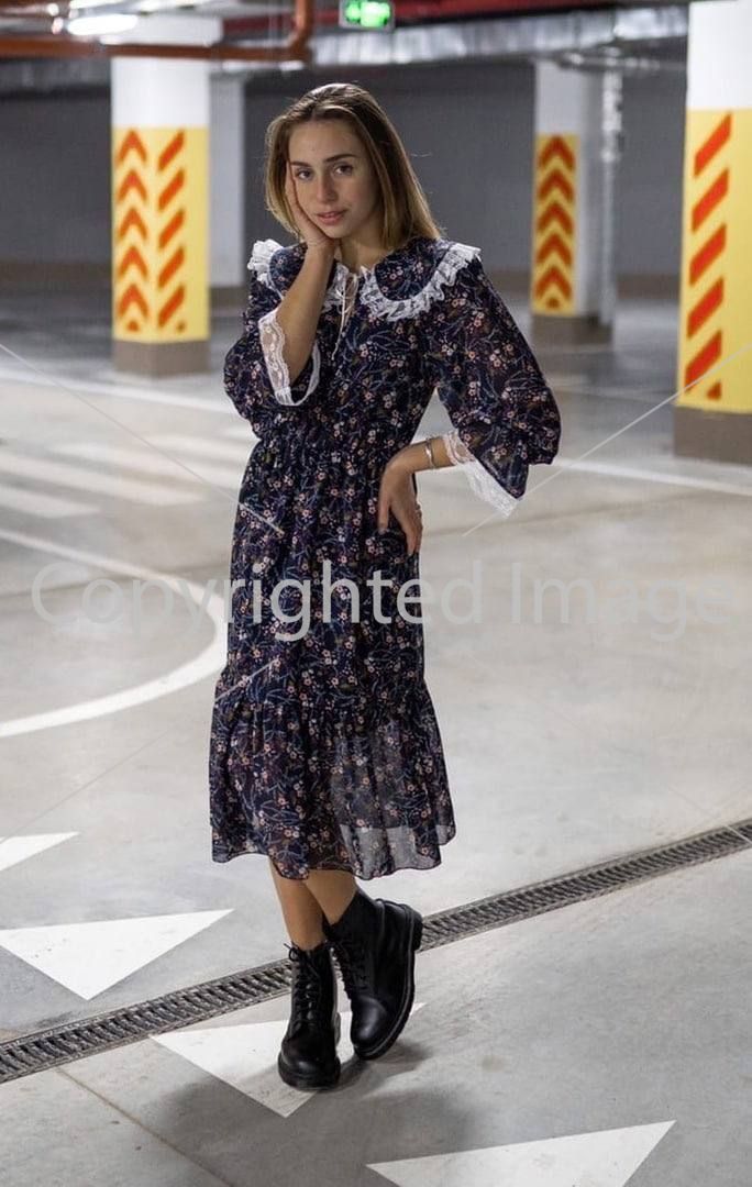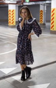 материал: шифон, подкладка - шифон. Отделка - кружево, на талии и рукавах резиночка. Длина платья 117 см, длина рукава 48 см.