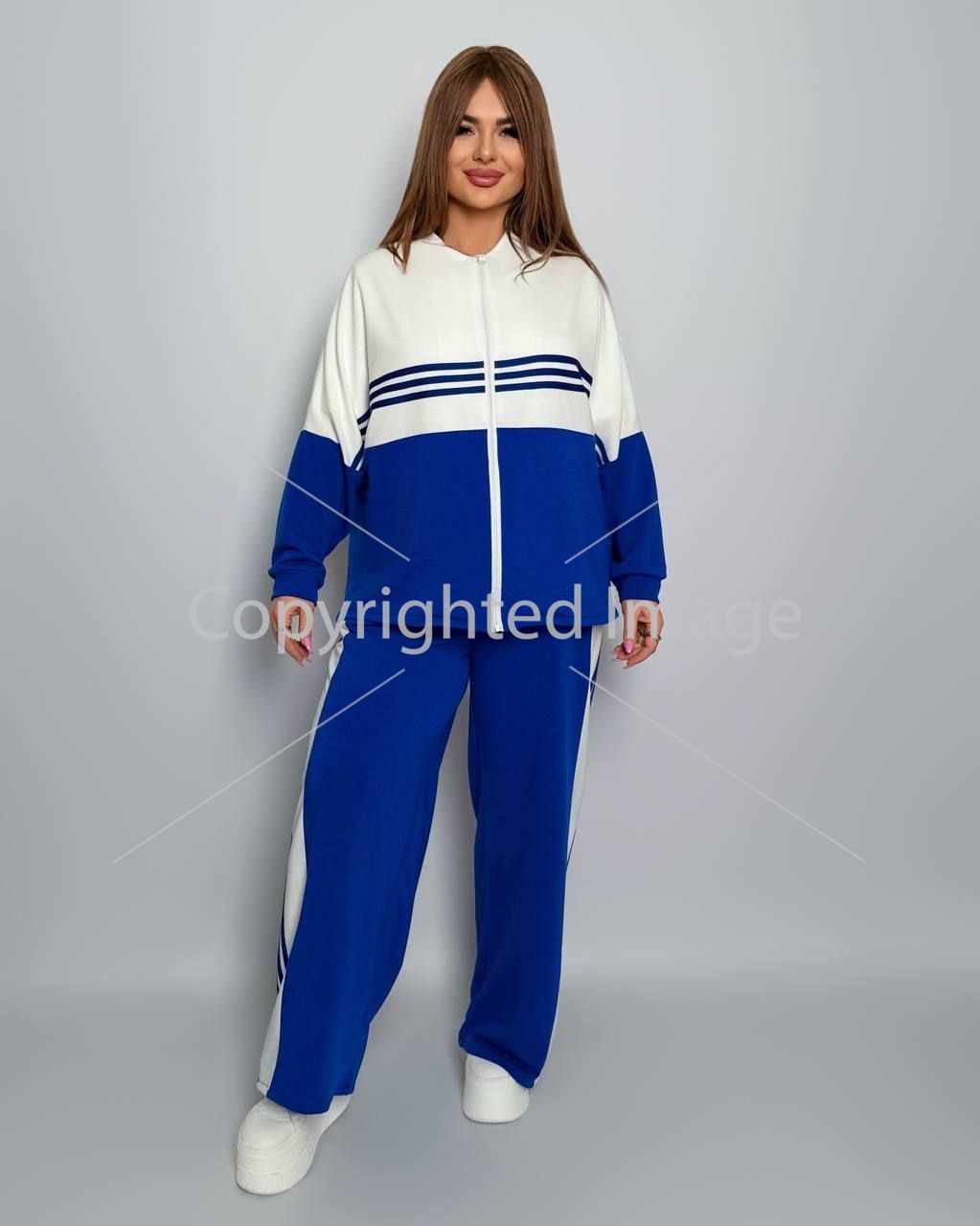 Довжина штанів : 106 см Штани з ломпасом , з високою посадкою , пояс на гумці , бічні кишені . Кофта прямого покрою , з ломпасом , низ на фіксаторі , на блискавці .