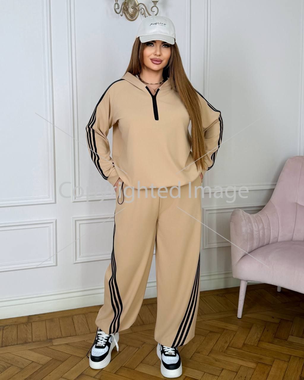 Довжина штанів : 106 см Штани з ломпасом , з високою посадкою , пояс на гумці , бічні кишені , низ на фіксаторі . Кофта прямого покрою низ на фіксаторі , з капюшоном на блискавці , рукав з ломпасом .