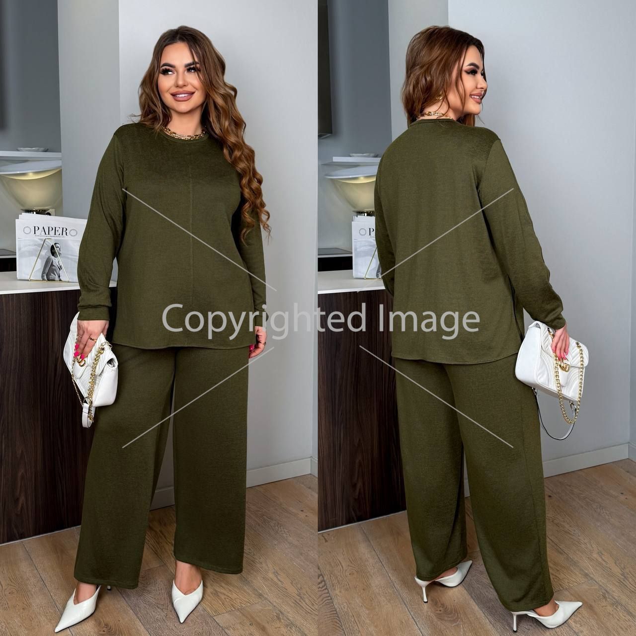 Довжина штанів : 106 см. Широкі штани з високою посадкою , пояс на гумці , бічні кишені . Кофта прямого покрою з бічними розрізами .