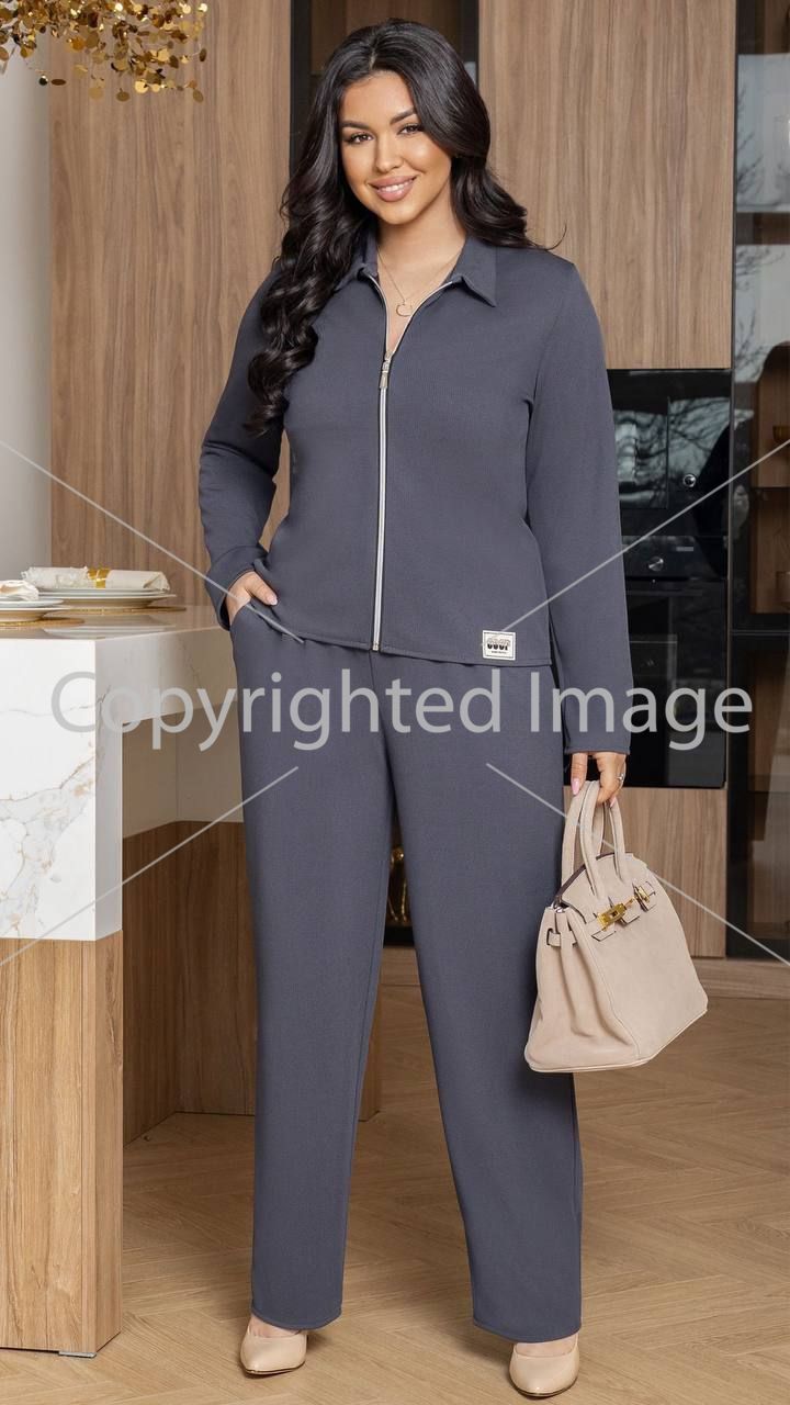 Практичний стильний костюм , штани з високою посадкою , прямого покрою , з бічними кишенями , пояс на гумці . Кофта прямого покрою з коміром , на блискавці . Тканина гарної якості , зносостійка , приємна на дотик , гарно тягнеться .