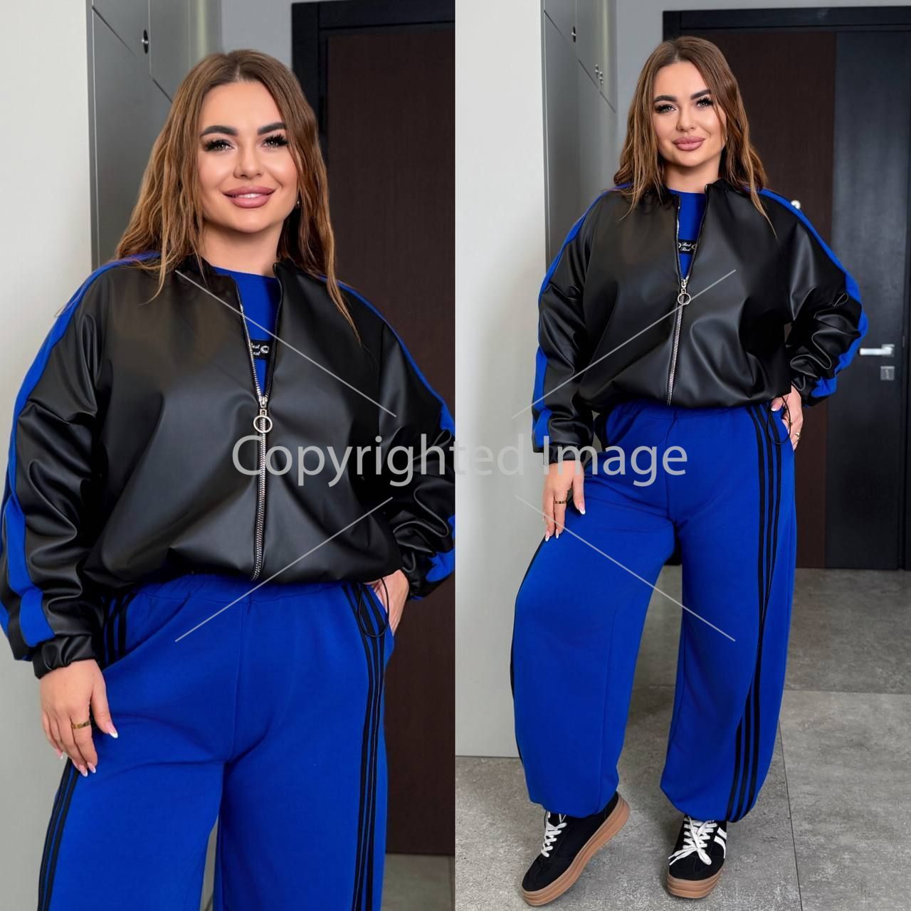 Стильний костюм трійка - куртка + кофта + штани . Куртка на блискавці , рукав з ломпасом , низ на фіксаторі , на підкладці . Кофта прямого покрою на манжеті , рукав з ломпасом . Штани з бічними ломпасами , з високою посадкою , пояс на гумці , з бічними кишенями , низ на фіксаторі .