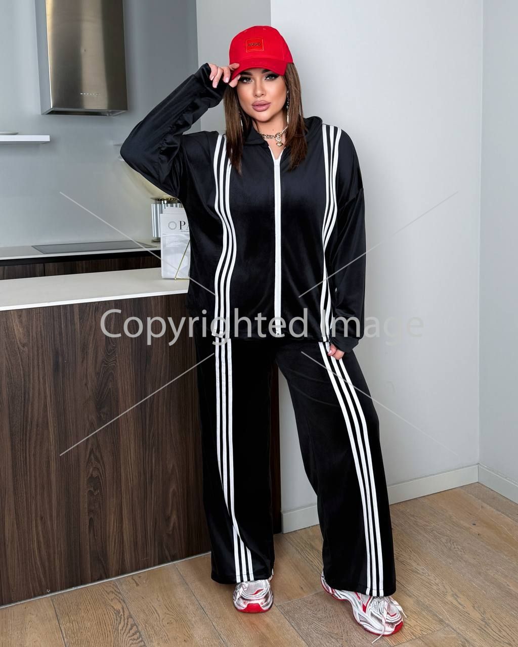 Довжина штанів : 106 см Штани з високою посадкою , пояс на гумці , ломпаси , бічні кишені , низ на фіксаторі . Кофта прямого покрою , з ломпасом , на блискавці , з капюшоном низ на фіксаторі .