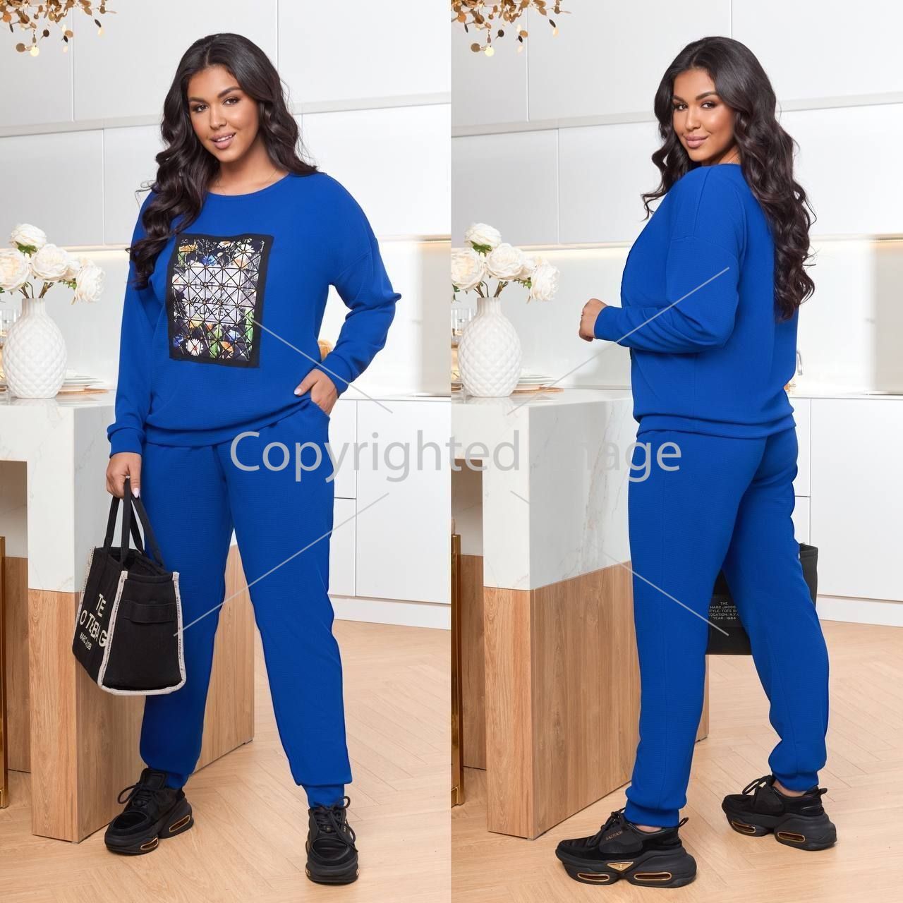 Практичний повсякденний костюм , штани на манжеті , з бічними кишенями , пояс на гумці , висока посадка . Кофта прямого покрою , з декор - нашивкою , на манжеті .