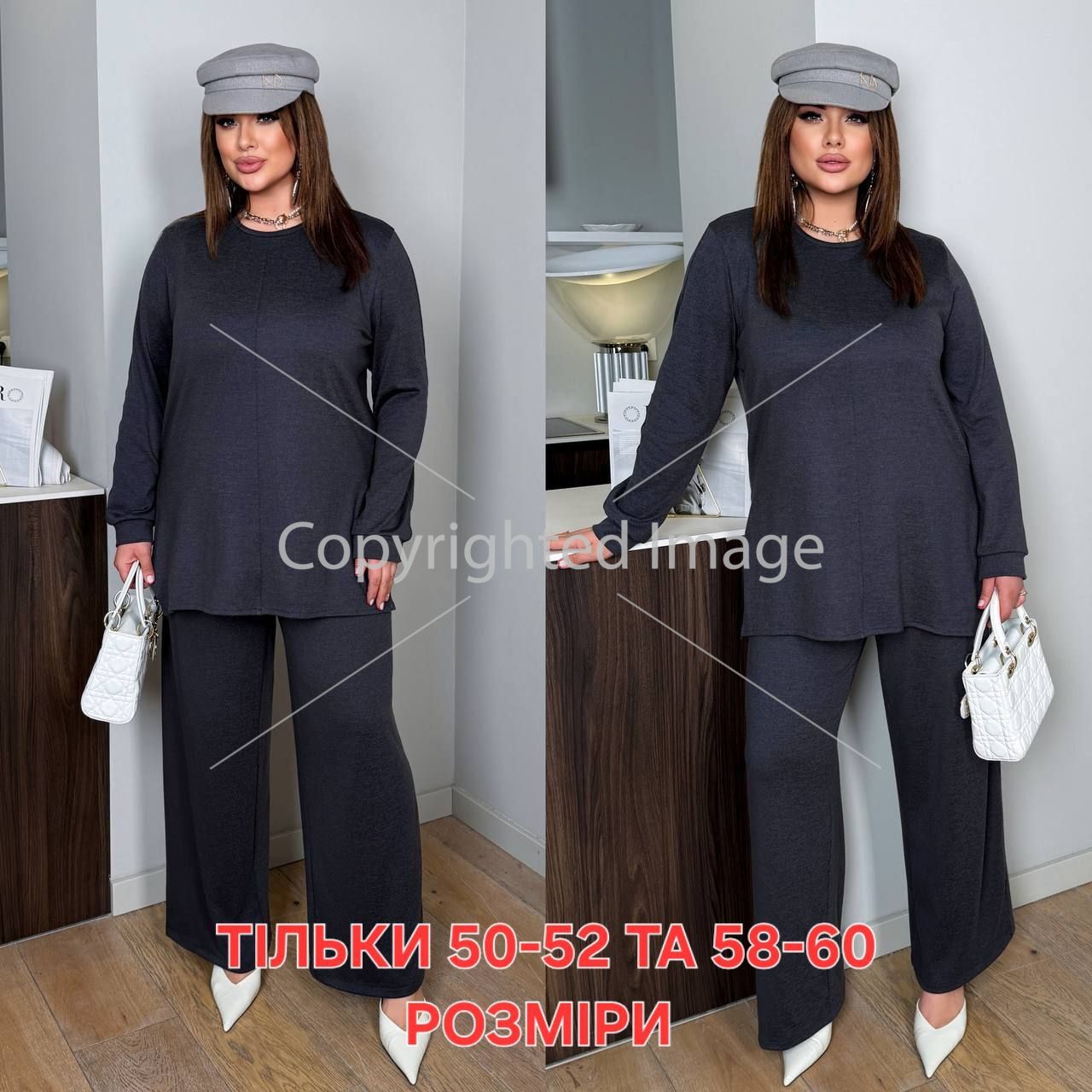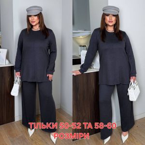 Довжина штанів : 106 см. Широкі штани з високою посадкою , пояс на гумці , бічні кишені . Кофта прямого покрою з бічними розрізами .
