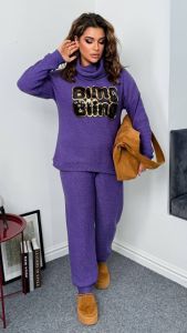 Довжина штанів : 106 см. Теплий костюм двійка . Кофта з обʼємним коміром , на манжеті . Штани з високою посадкою , пояс на гумці .