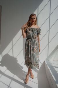 матеріал: шифон принт, підкладка - крепшифон, довжина від талії 77см, рукав - ліхтарик на резиночці і верх сукні на резиночці, можна одягати як з рукавчиком, так і зі спущеними плічкам