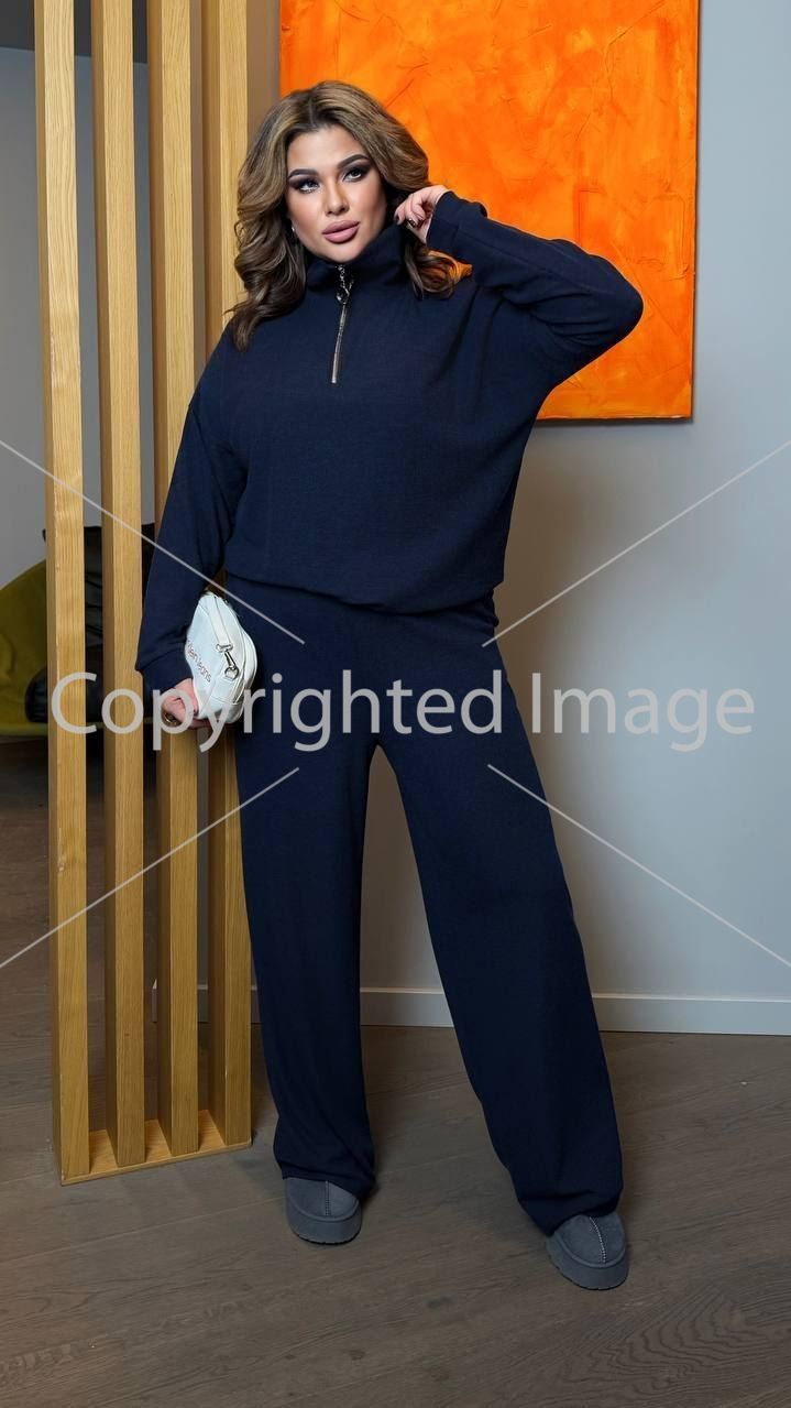 Довжина штанів : 110 см. Стильний костюм двійка . Штани з високою посадкою , пояс на гумці . Кофта прямого покрою на манжеті , комір на блискавці .