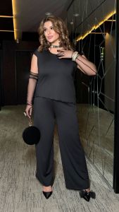 Довжина штанів : 110 см. Святковий костюм двійка . Штани з високою посадкою , пояс на гумці . Кофта прямого покрою з заду подовжена .
