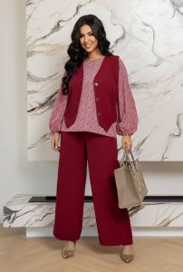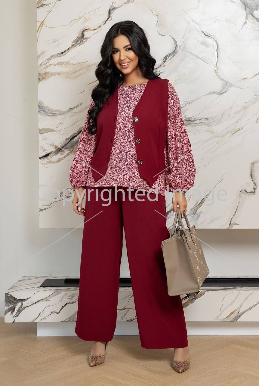 Трендова трійка цього сезону - штани + жилетка + блуза , штани вільного покрою , з бічними кишенями , пояс на гумці . Жилетка прямого покрою , на ґудзиках , з заду завʼязка . Блуза з обʼємними рукавами низ на резинці . Тканина гарної якості , зносостійка , не леняє , не кашлатиться , приємна на дотик .