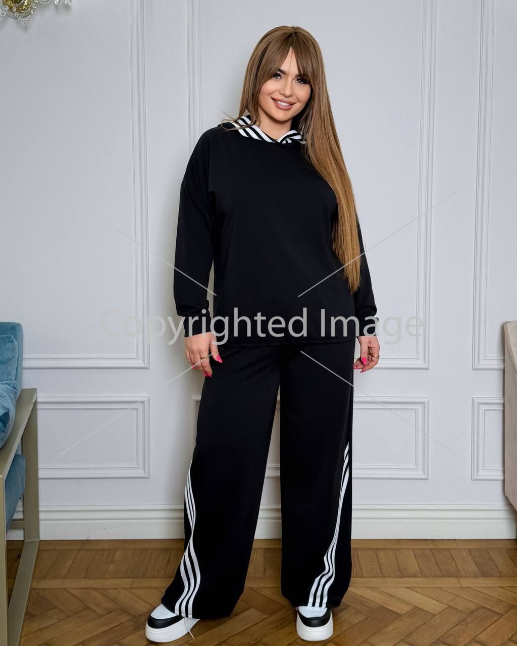 Стильний костюм дійка -кофта + штани . . Кофта прямого покрою низ на фіксаторі , капюшон з ломпасом . Штани з ломпасами , з високою посадкою , пояс на гумці , з бічними кишенями , низ на фіксаторі .