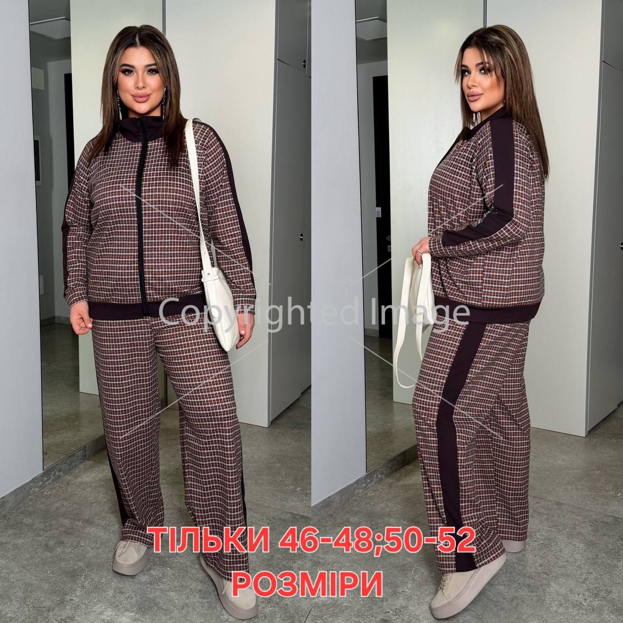 Довжина штанів : 106 см Штани з ломпасами , висока посадка , пояс на гумці , бічні кишені . Кофта прямого покрою , рукав з ломпасом , на блискавці .