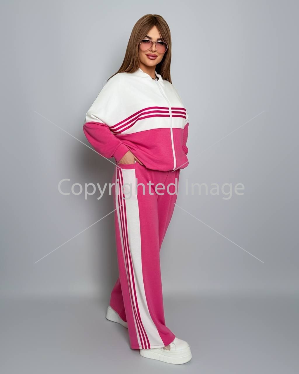 Довжина штанів : 106 см Штани з ломпасом , з високою посадкою , пояс на гумці , бічні кишені . Кофта прямого покрою , з ломпасом , низ на фіксаторі , на блискавці .