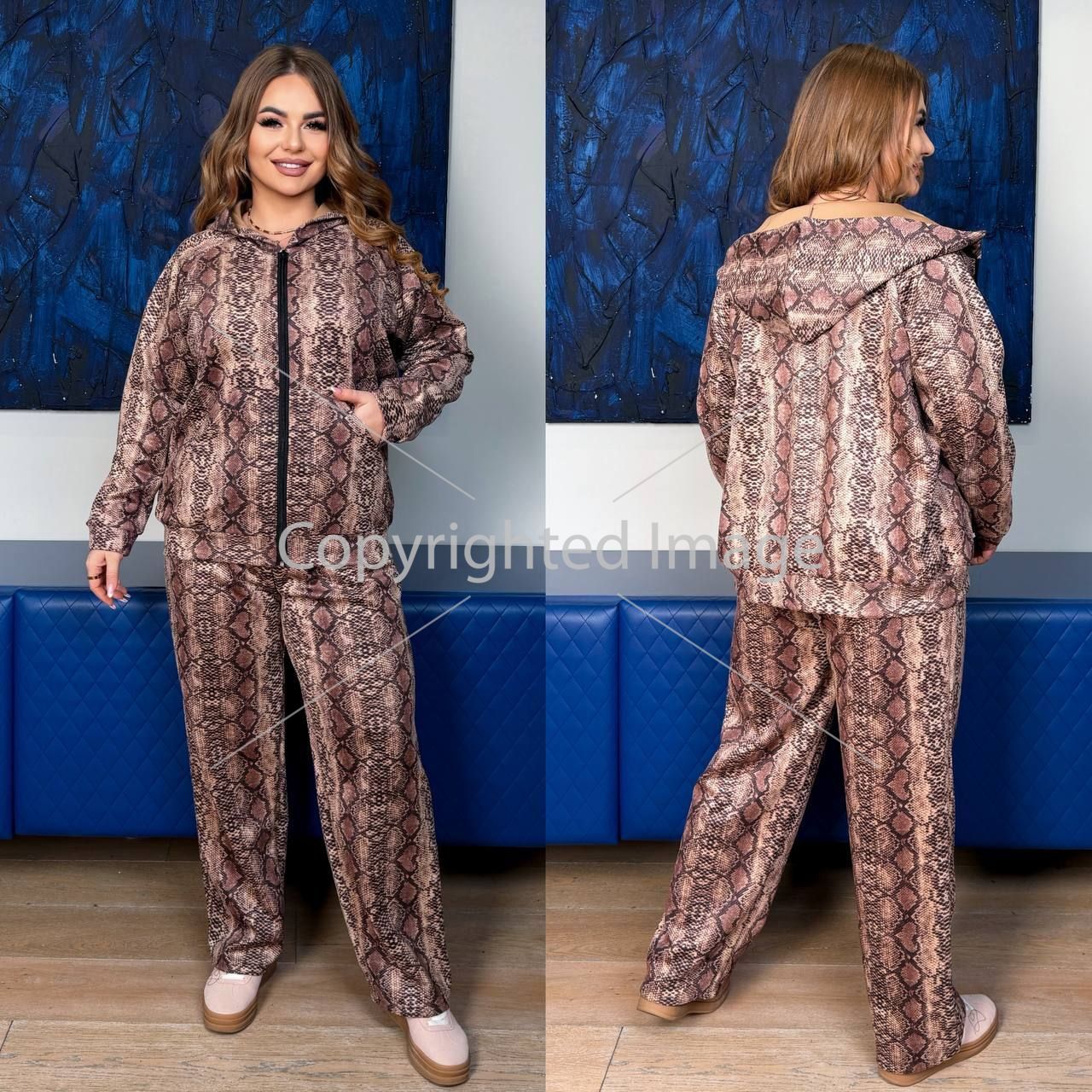 Довжина штанів : 106 см Штани з високою посадкою , пояс на гумці , бічні кишені . Кофта прямого покрою , з капюшоном , на блискавці , кишеня кенгуру