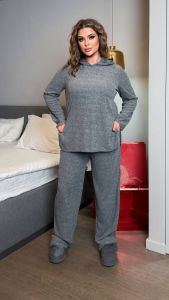 Довжина штанів : 106 см. Стильний костюм двійка . Штани з високою посадкою , пояс на гумці . Кофта прямого покрою з бічними розрізами , та капюшоном .
