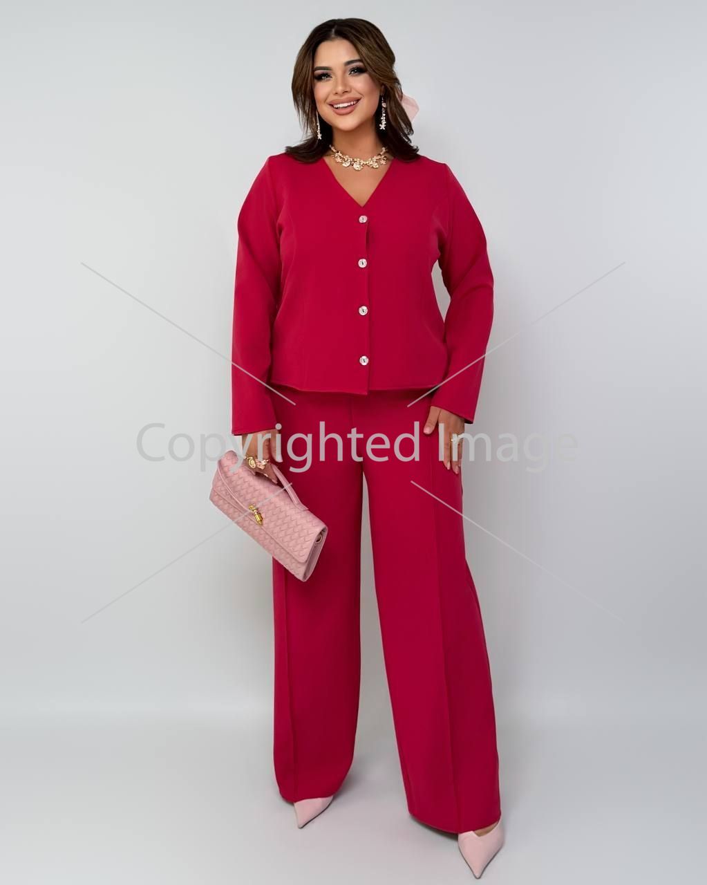 Штани з високою посадкою , пояс на гумці , бічні кишені , з переду стрілки . Піджак на ґудзиках з заду завʼязка .