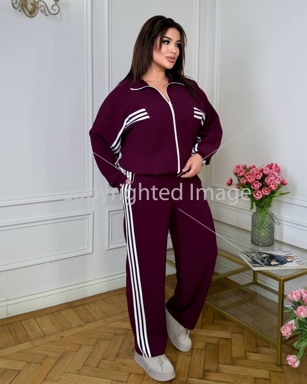 Довжина штанів : 107 см. Штани з високою посадкою , пояс на гумці , бічні кишені , бічні ломпаси . Кофта прямого покрою на блискавці , комір стійка , низ на фіксаторі .