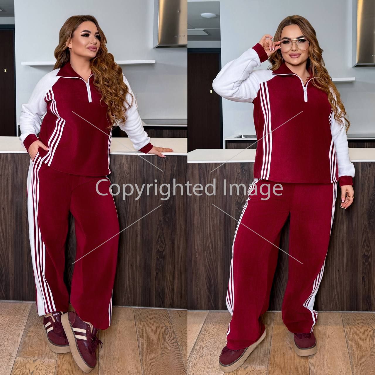 Довжина штанів : 110 см. Штани з ломпасом , з високою посадкою , пояс на гумці , бічні кишені , низ на фіксаторі . Кофта з ломпасом прямого покрою , з коміром на блискавці , рукав реглан .