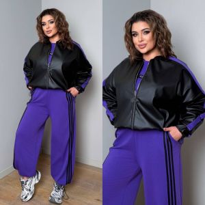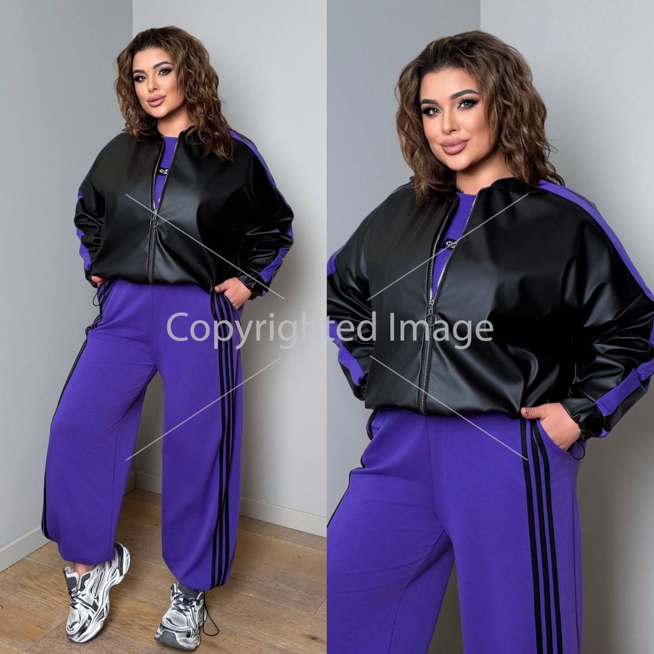 Стильний костюм трійка - куртка + кофта + штани . Куртка на блискавці , рукав з ломпасом , низ на фіксаторі , на підкладці . Кофта прямого покрою на манжеті , рукав з ломпасом . Штани з бічними ломпасами , з високою посадкою , пояс на гумці , з бічними кишенями , низ на фіксаторі .