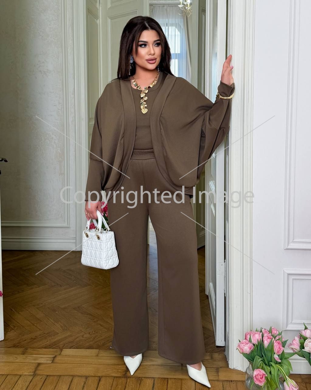Стильний костюм трійка - кардиган + футболка + штани . Футболка прямого покрою , кардиган вільного покрою . Штани з високою посадкою , пояс на гумці , з бічними кишенями .