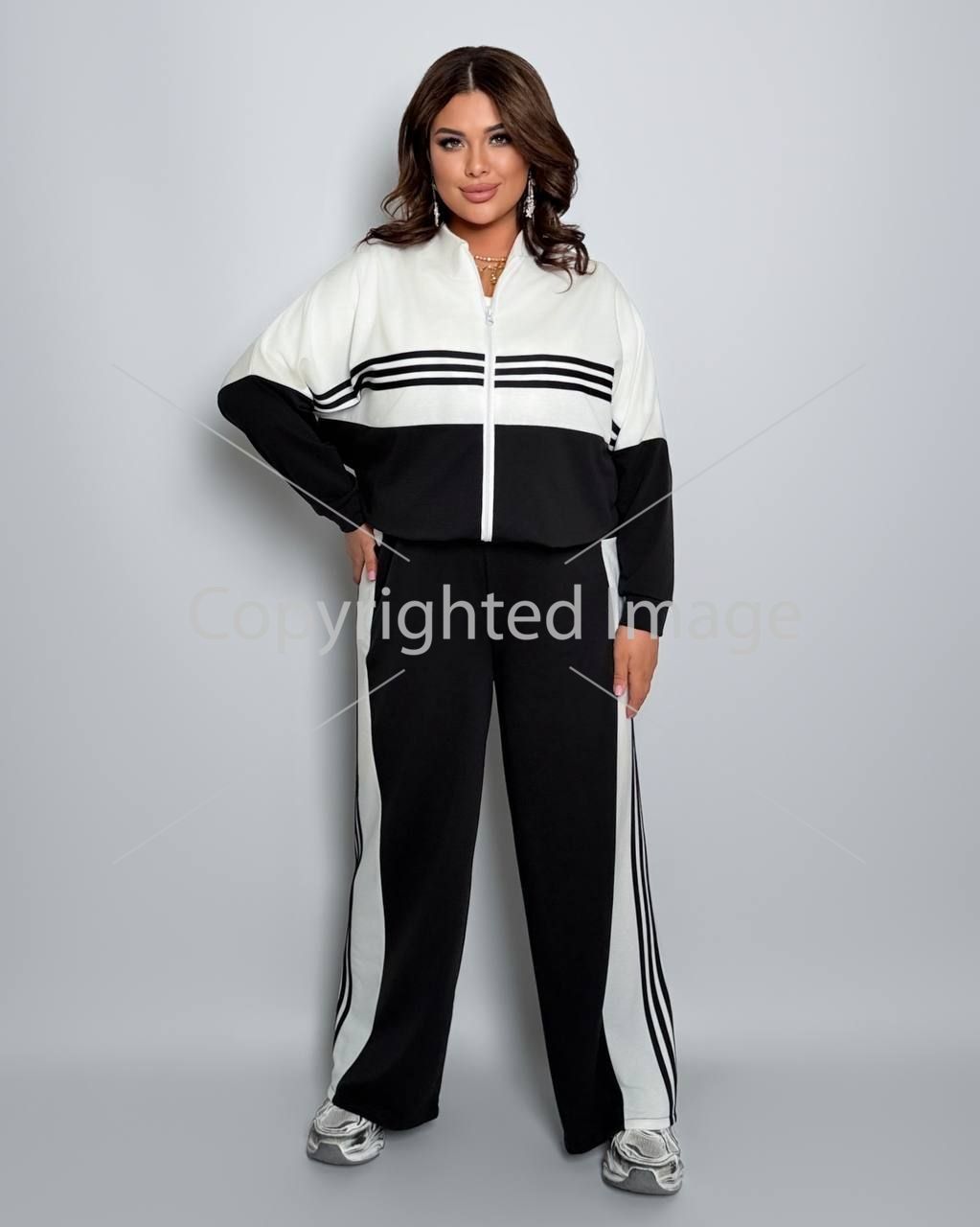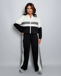 Довжина штанів : 106 см Штани з ломпасом , з високою посадкою , пояс на гумці , бічні кишені . Кофта прямого покрою , з ломпасом , низ на фіксаторі , на блискавці .