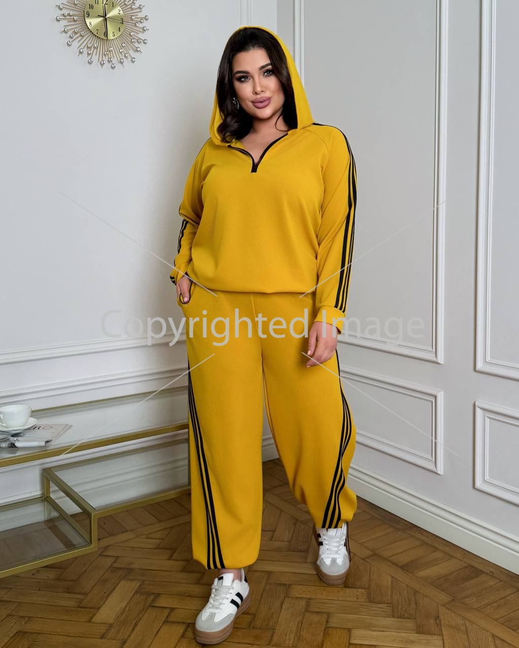 Довжина штанів : 106 см Штани з ломпасом , з високою посадкою , пояс на гумці , бічні кишені , низ на фіксаторі . Кофта прямого покрою низ на фіксаторі , з капюшоном на блискавці , рукав з ломпасом .